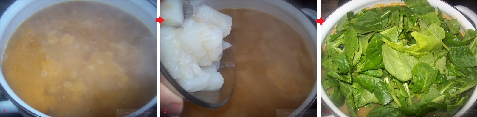 Añadimos al guiso el bacalao y las espinacas.Éstas, merman mucho por lo que no os preocupéis si al principio cubren toda la olla.